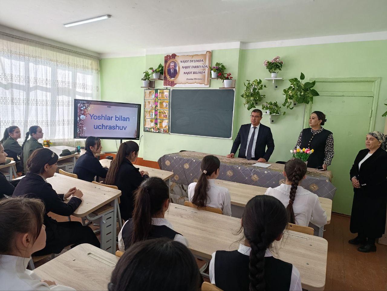 Шунингдек, ёшларга Ўзбекистон Республикаси Президентининг 2025 йил 3 ноябрдаги “Ахоли саломатлиги ва миллат генофондини гиёҳвандлик ва наркожиноятлардан самарали ҳимоя қилиш бўйича коиплекс чора тадбирлар” тўғрисидаги Фармони, 2026 йил 5 январдаги “Республика маҳаллаларида хавфсиз муҳитни яратиш йўналишида яхлит манзилли ишлаш тизимини жорий этишга қаратилган қўшимча чора-тадбирлар тўғрисида”ги Қарори, 2026 йил 16 февралдаги “Мамлакат тараққиётининг 2030 йилгача мўлжалланган устувор йўналишлари доирасида ислоҳотларни изчил давом эттириш ва янги босқичга олиб чиқишнинг қўшимча чора-тадбирлари тўғрисида”ги ПФ-21-сонли Фармони ҳамда 2026 йил 3 мартдаги “Аёллар ва болалар ҳуқуқларининг ҳимоясини кучайтириш ҳамда уларга нисбатан тазйиқ ва зўравонлик холатларининг олдини олиш бўйича қўшимча ташкилий-ҳуқуқий чоралар тўғрисида”ги ПФ-33-сонли Фармонлари мазмун-моҳияти, ҳуқуқий саводхонликни ошириш, жиноятчилик ва ҳуқуқбузарликларнинг олдини олиш юзасидан батафсил тушунтиришлар берилди.